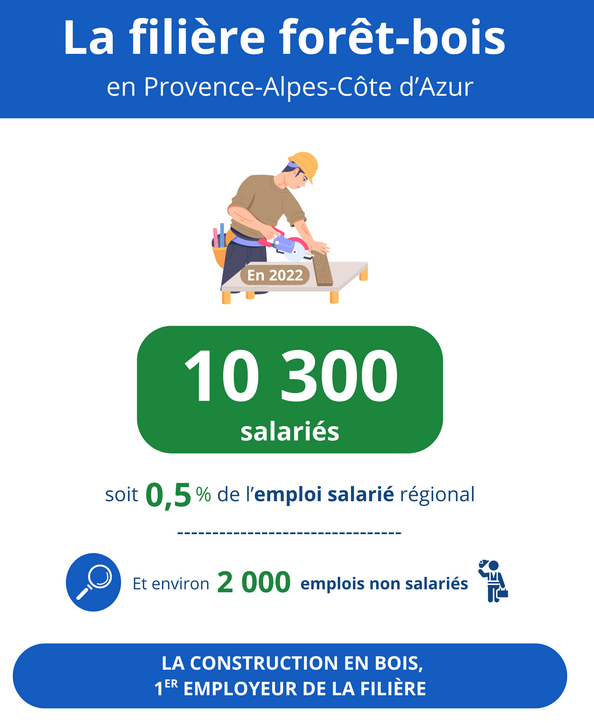 En 2022, la filière forêt-bois de Provence-Alpes-Côte d’Azur emploie 10 300 salariés, soit 0,5 % de l’emploi salarié total de la région. S’y ajoutent environ 2 000 emplois non salariés. La filière forêt- bois se structure en plusieurs segments qui interagissent entre eux et repose principalement sur de petits établissements. Le premier employeur de cette filière est la construction en bois.